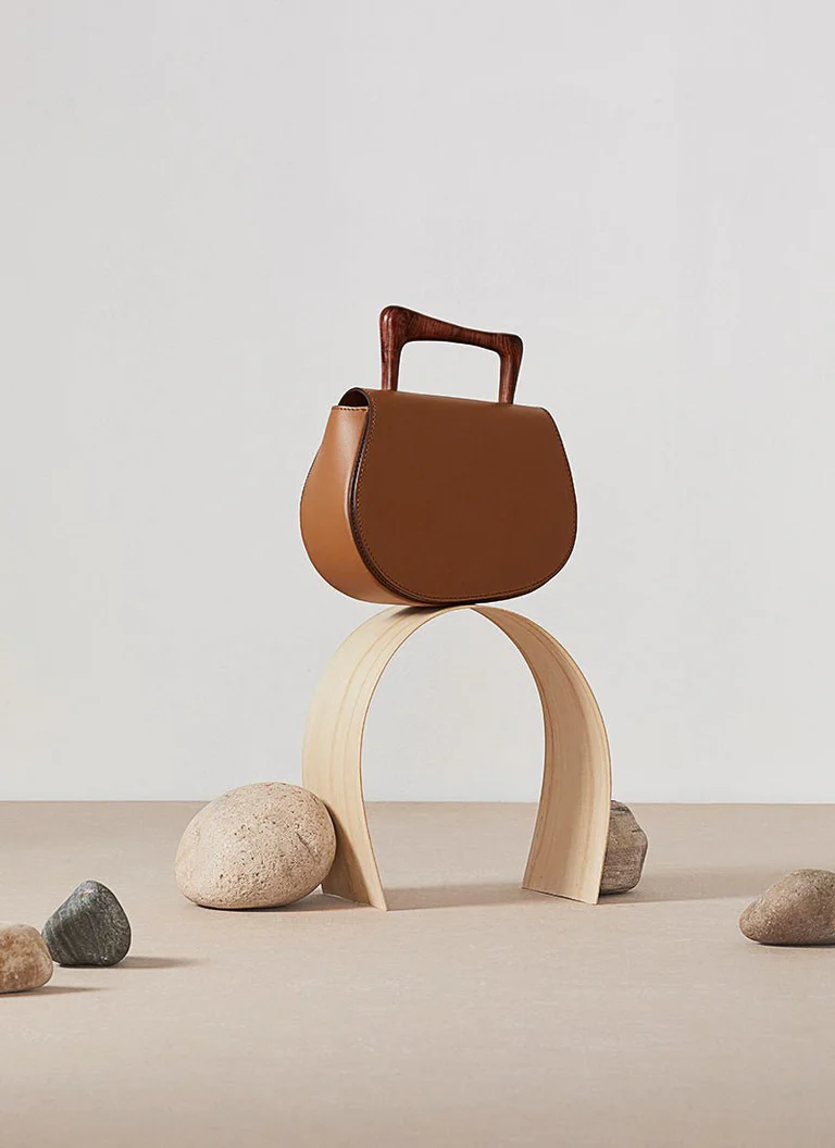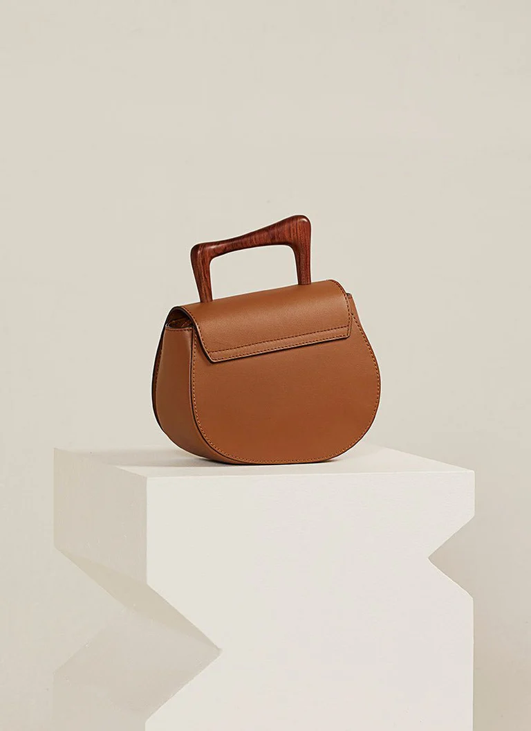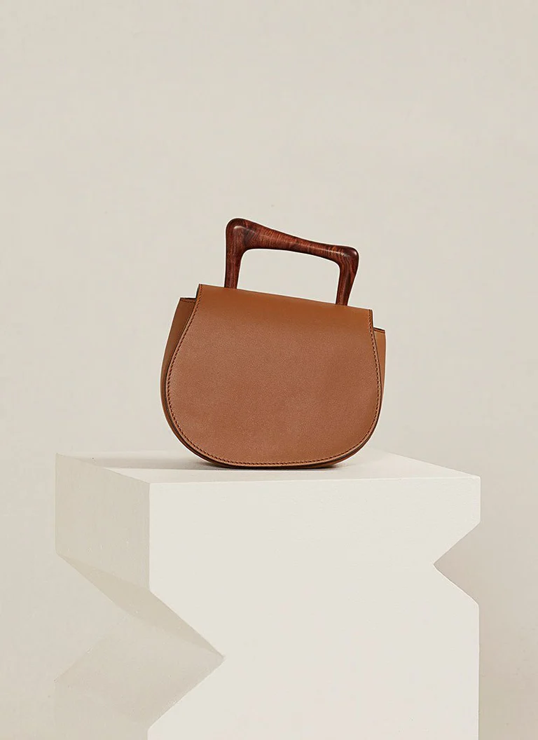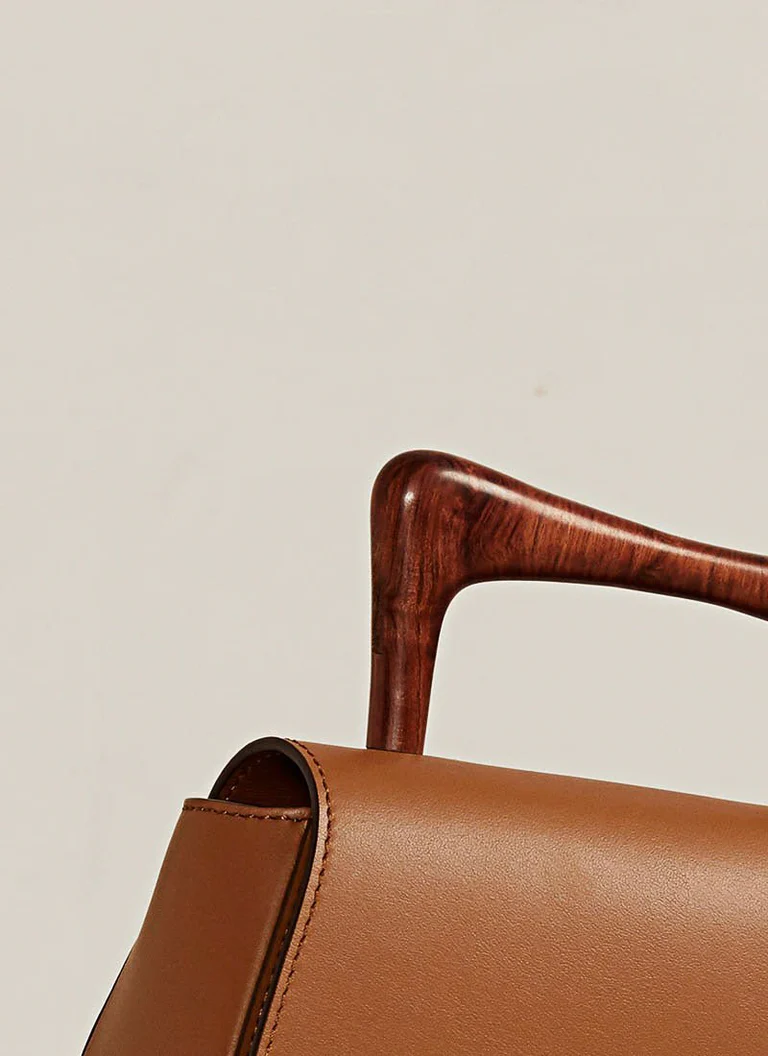 Pega em Madeira Artesanal: Equipada com uma pega em madeira cuidadosamente trabalhada, este detalhe artesanal enriquece o design da mala , oferecendo um contraste de texturas e reforçando a herança artesanal da marca.