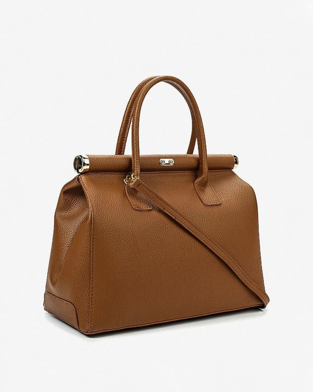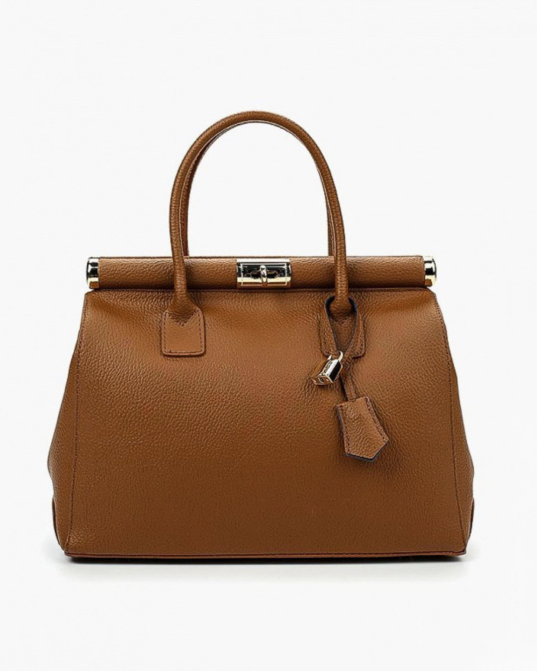 • Mala de mão em pele castanha com fecho dourado e cadeado decorativo
