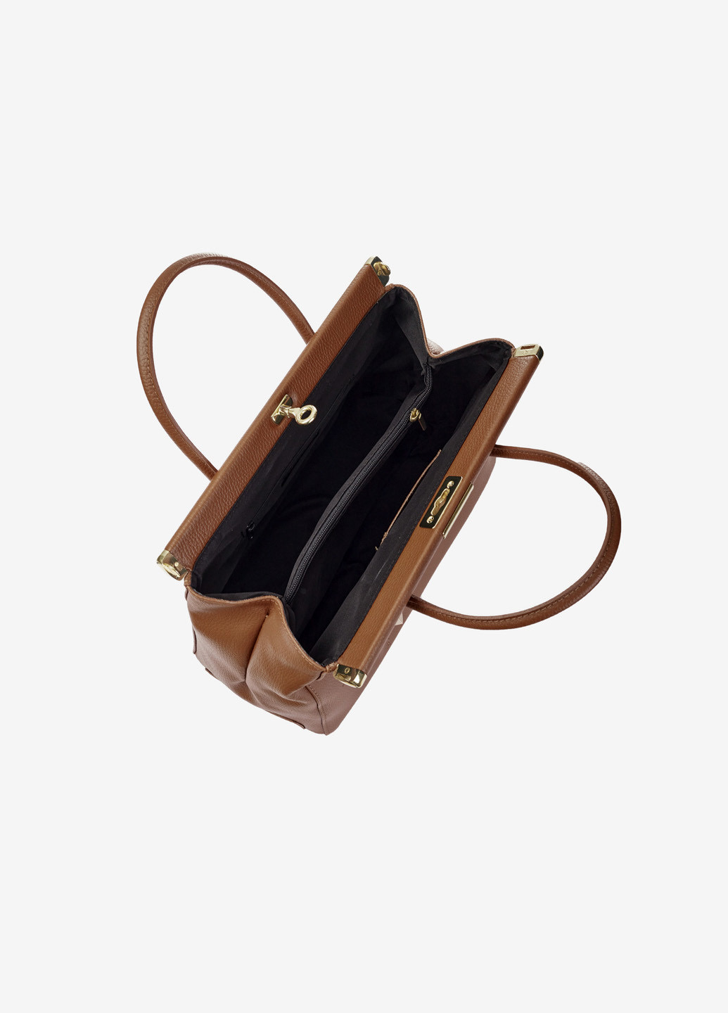 • Mala de mão castanha em pele com interior preto e fecho dourado aberta