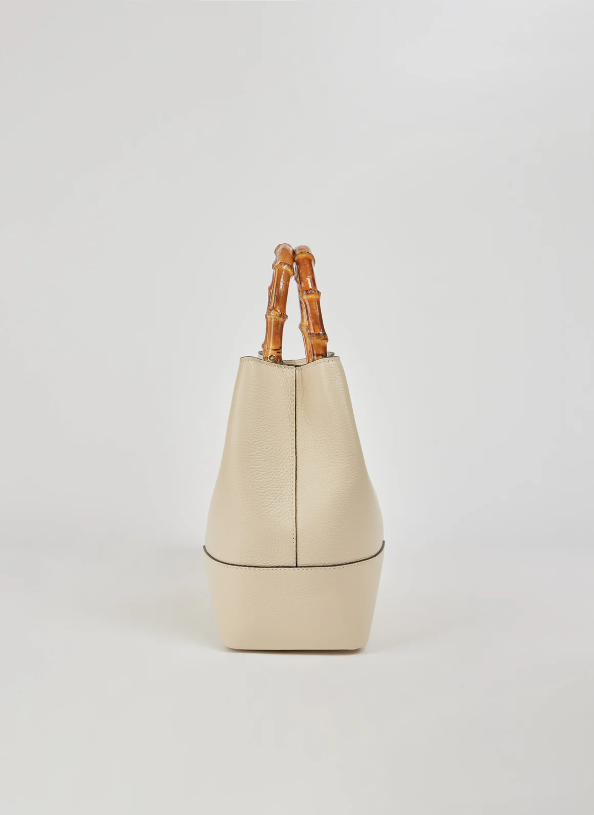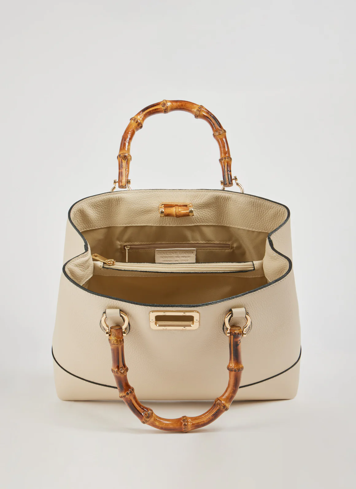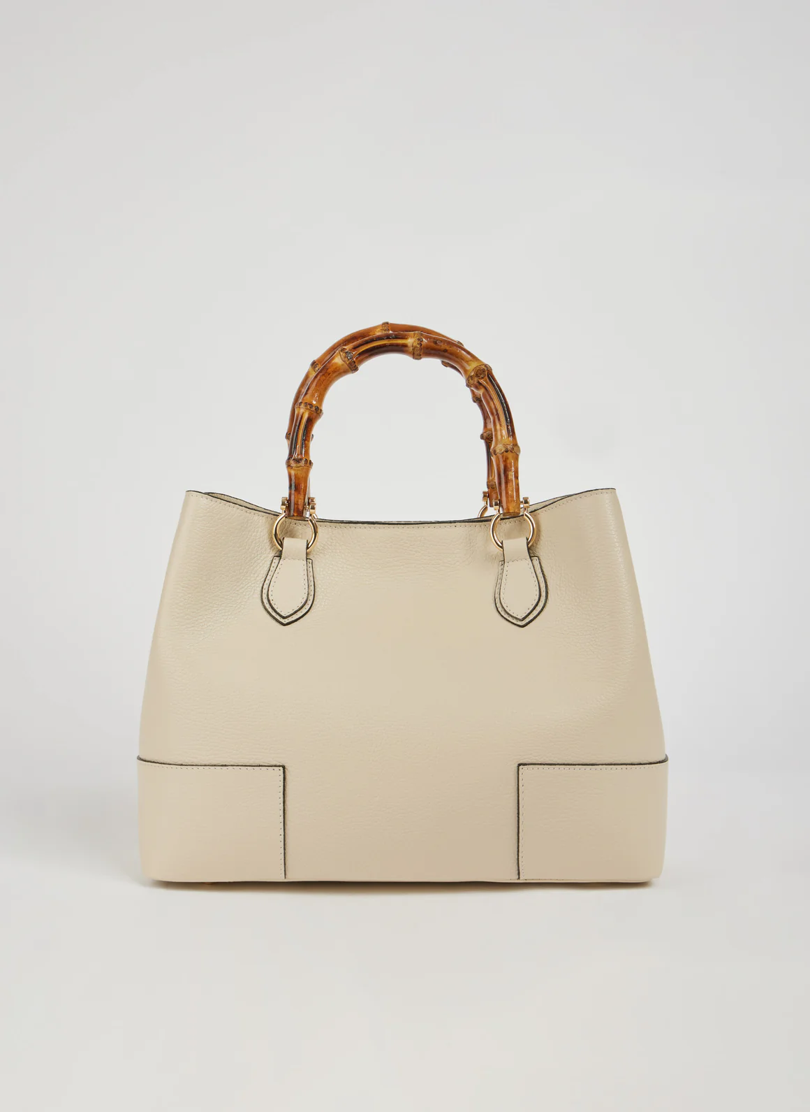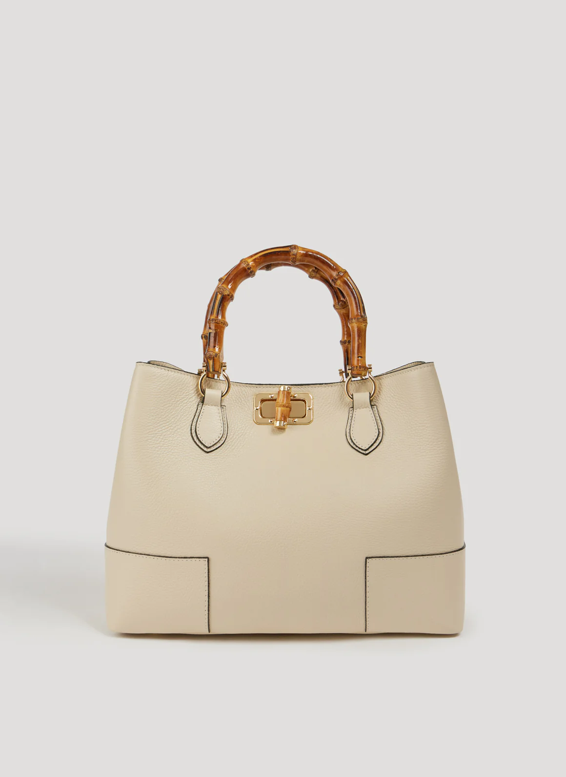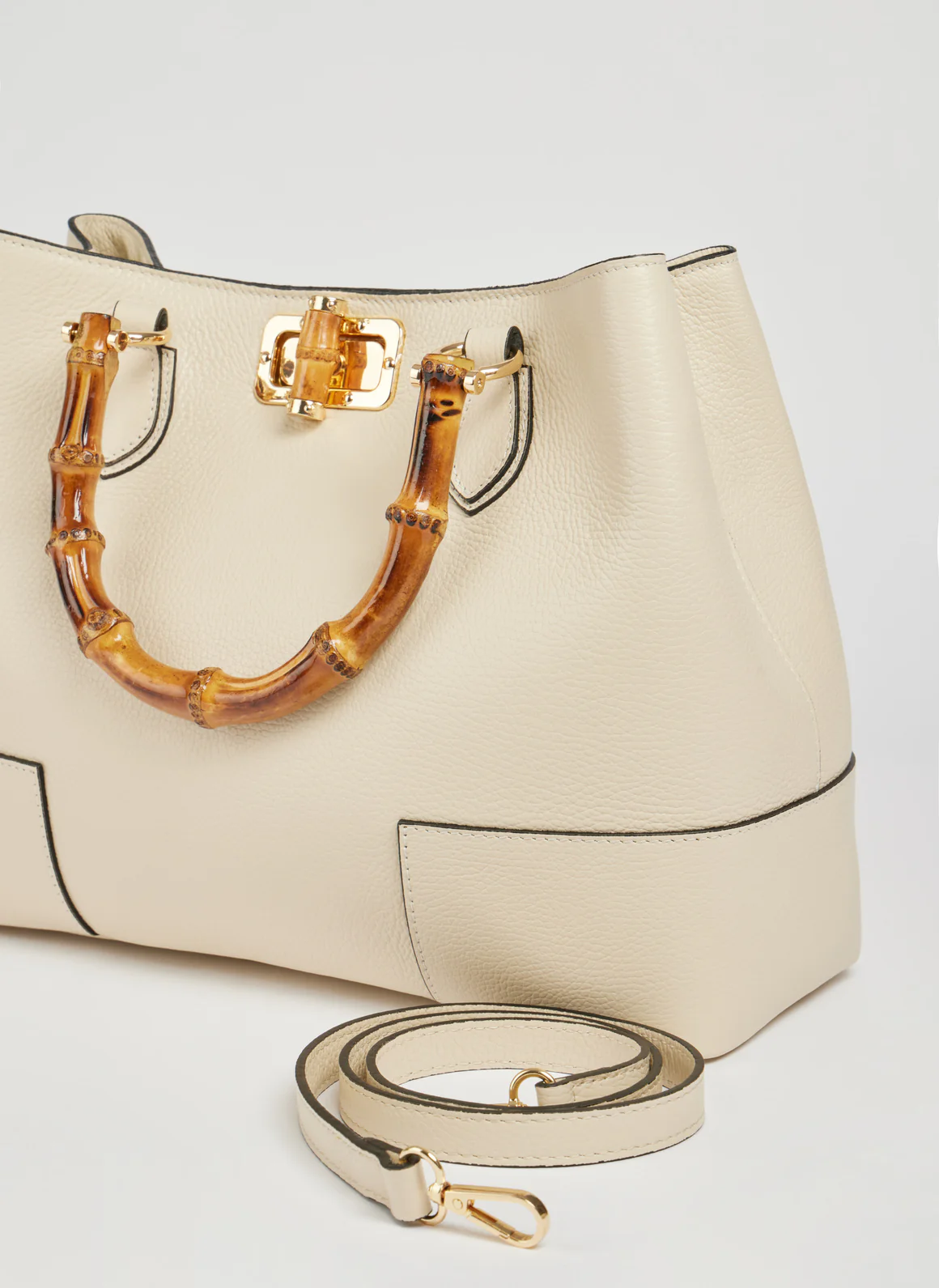 O design é valorizado pelas alças em bambu natural, um detalhe icónico inspirado no estilo italiano clássico. Esta combinação cria uma mala sofisticada, perfeita para mulheres que procuram uma mala de luxo em pele italiana com personalidade.