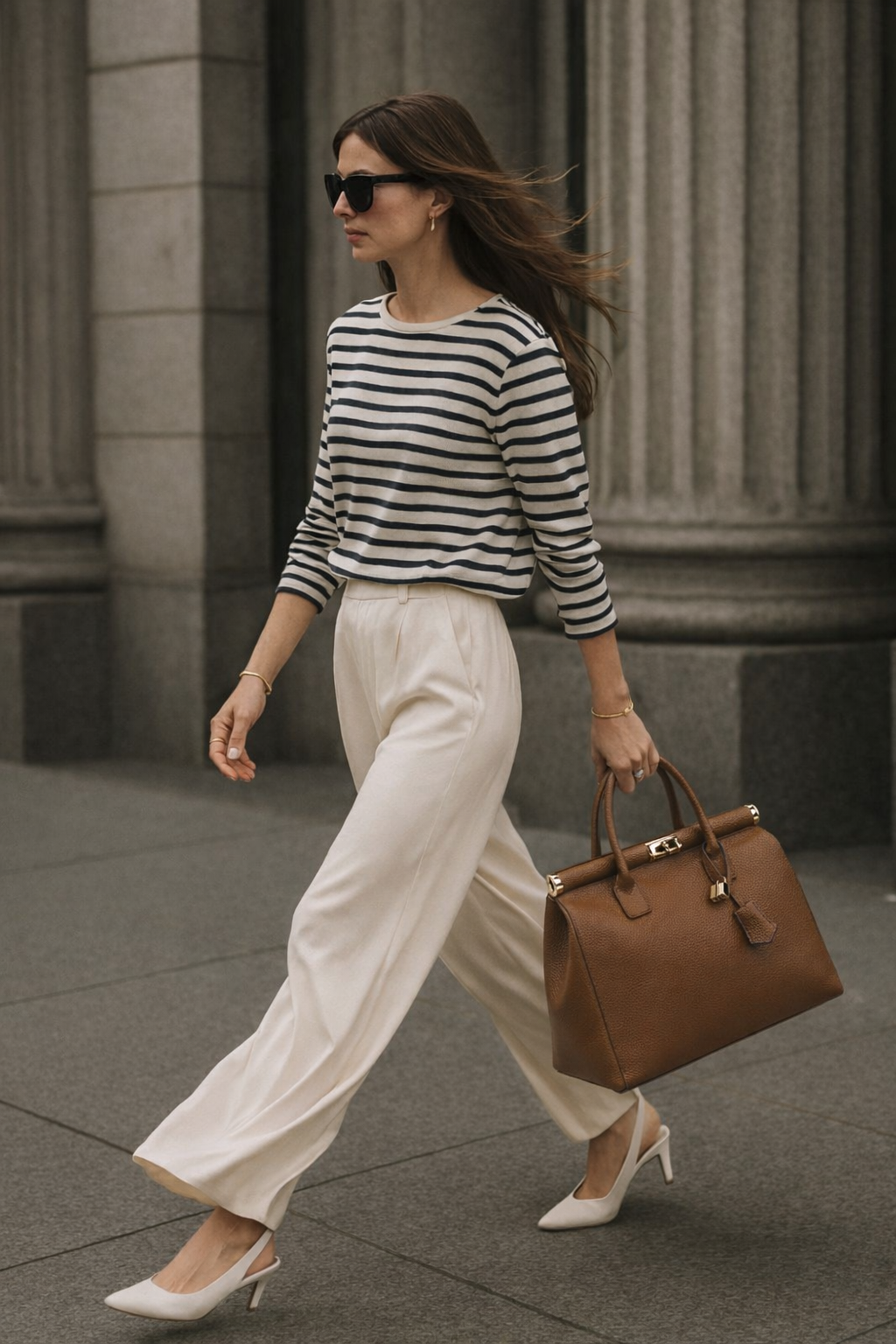 • Mulher com blusa às riscas pretas e brancas, calças creme, sapatos brancos, óculos pretos e mala castanha de pele a caminhar