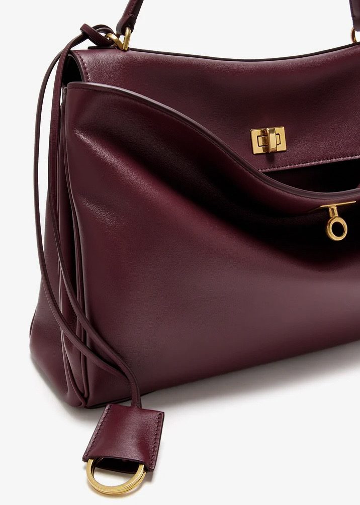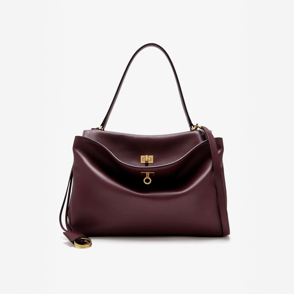 De capacidade média/grande, oferece fecho de aba com trava giratória, alça de ombro ajustável e removível em couro e chaveiro em couro com duas argolas abertas.