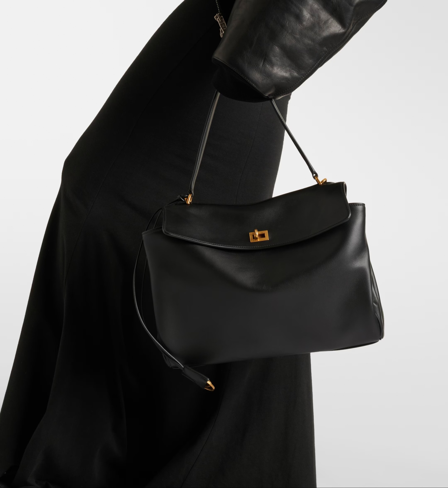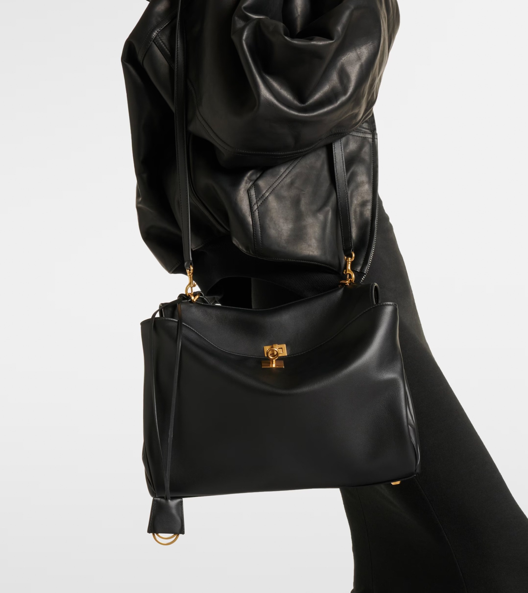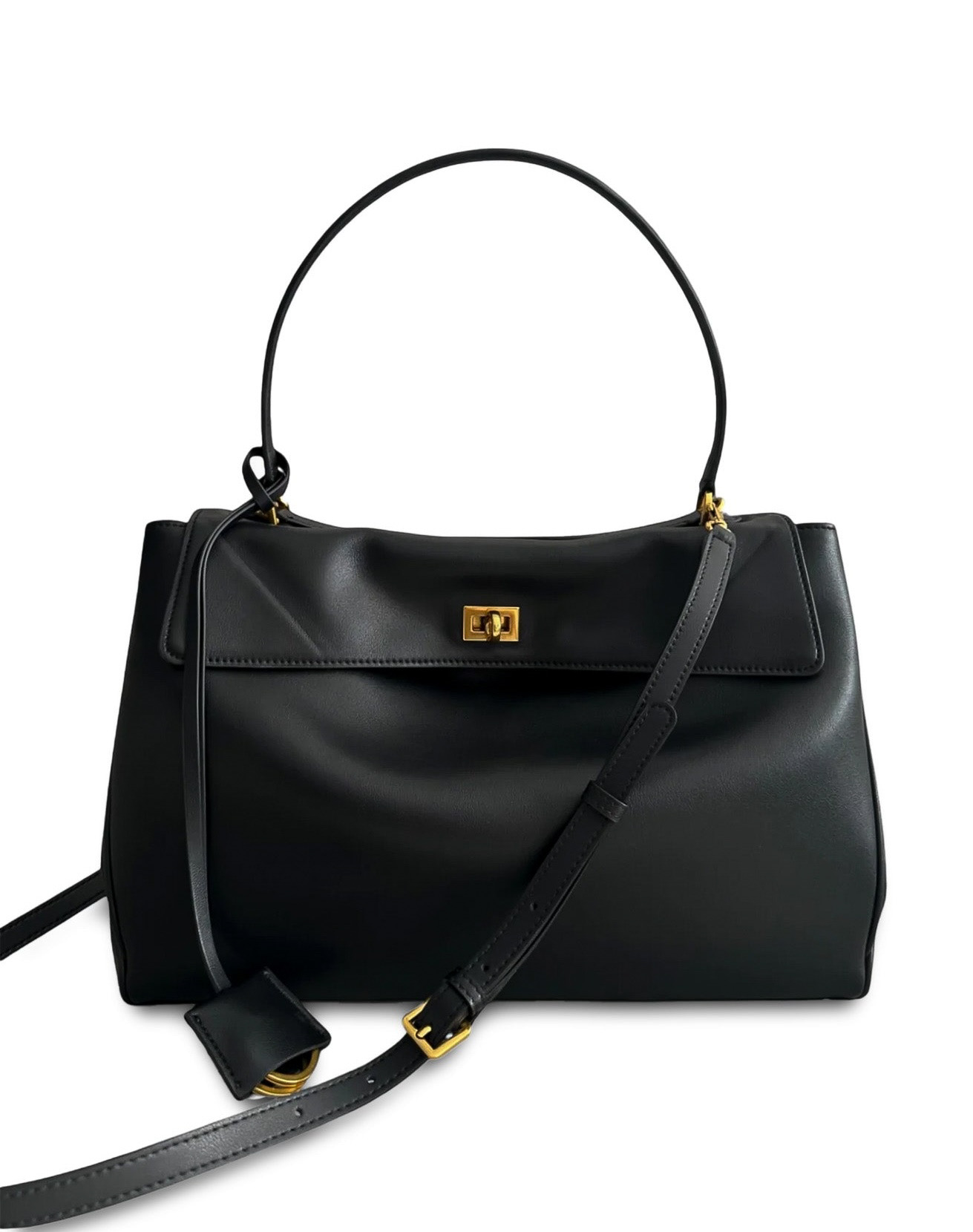 De capacidade média/grande, oferece fecho de aba com trava giratória, alça de ombro ajustável e removível em couro e chaveiro em couro com duas argolas abertas.