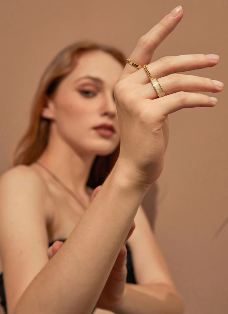 • Mão feminina com anéis dourados e prateado, em fundo bege