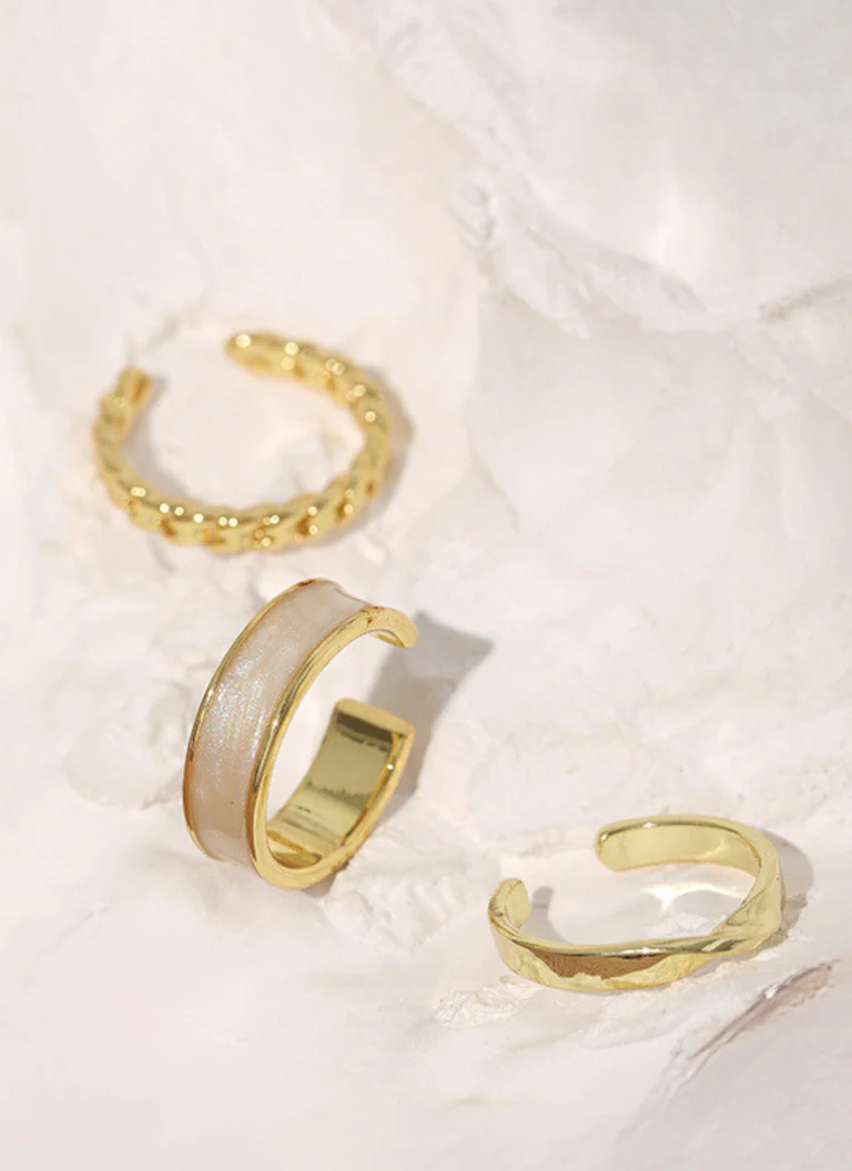 • Três anéis dourados de estilos variados sobre fundo branco irregular