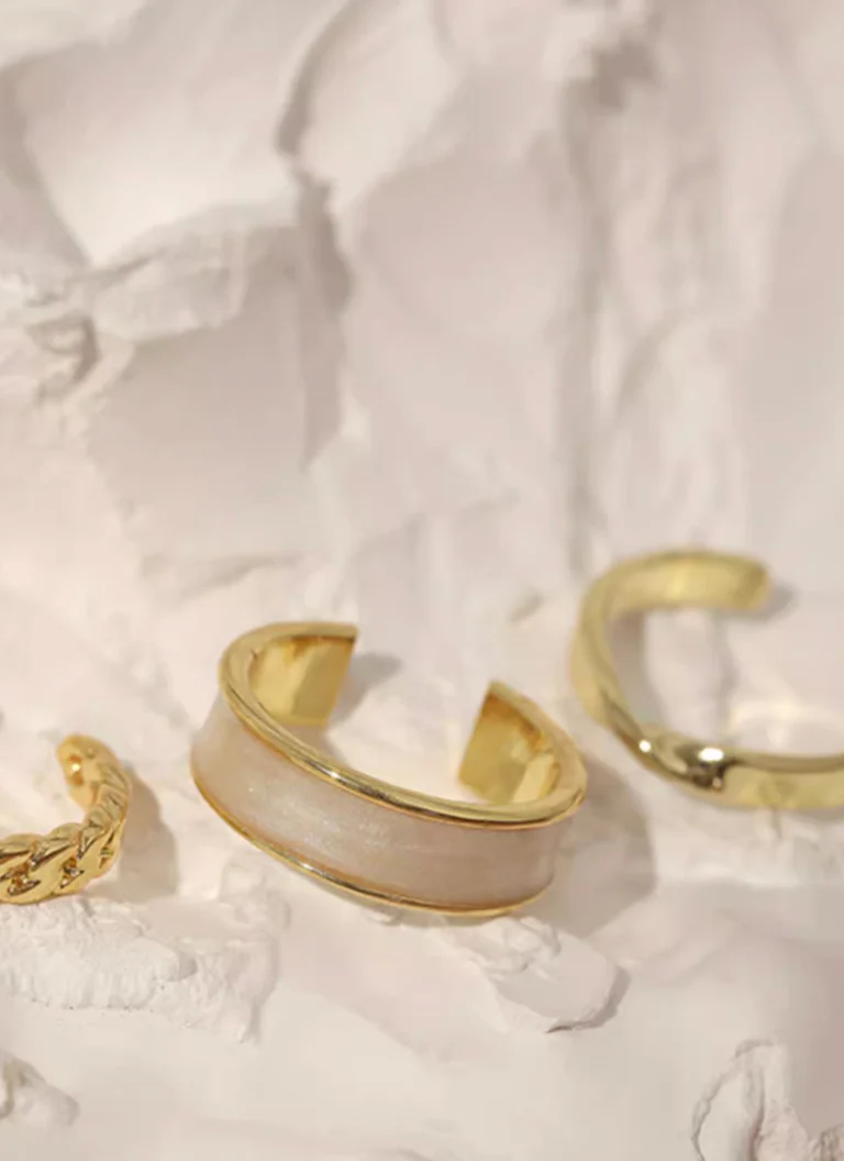 • Três anéis femininos dourados em fundo branco texturizado