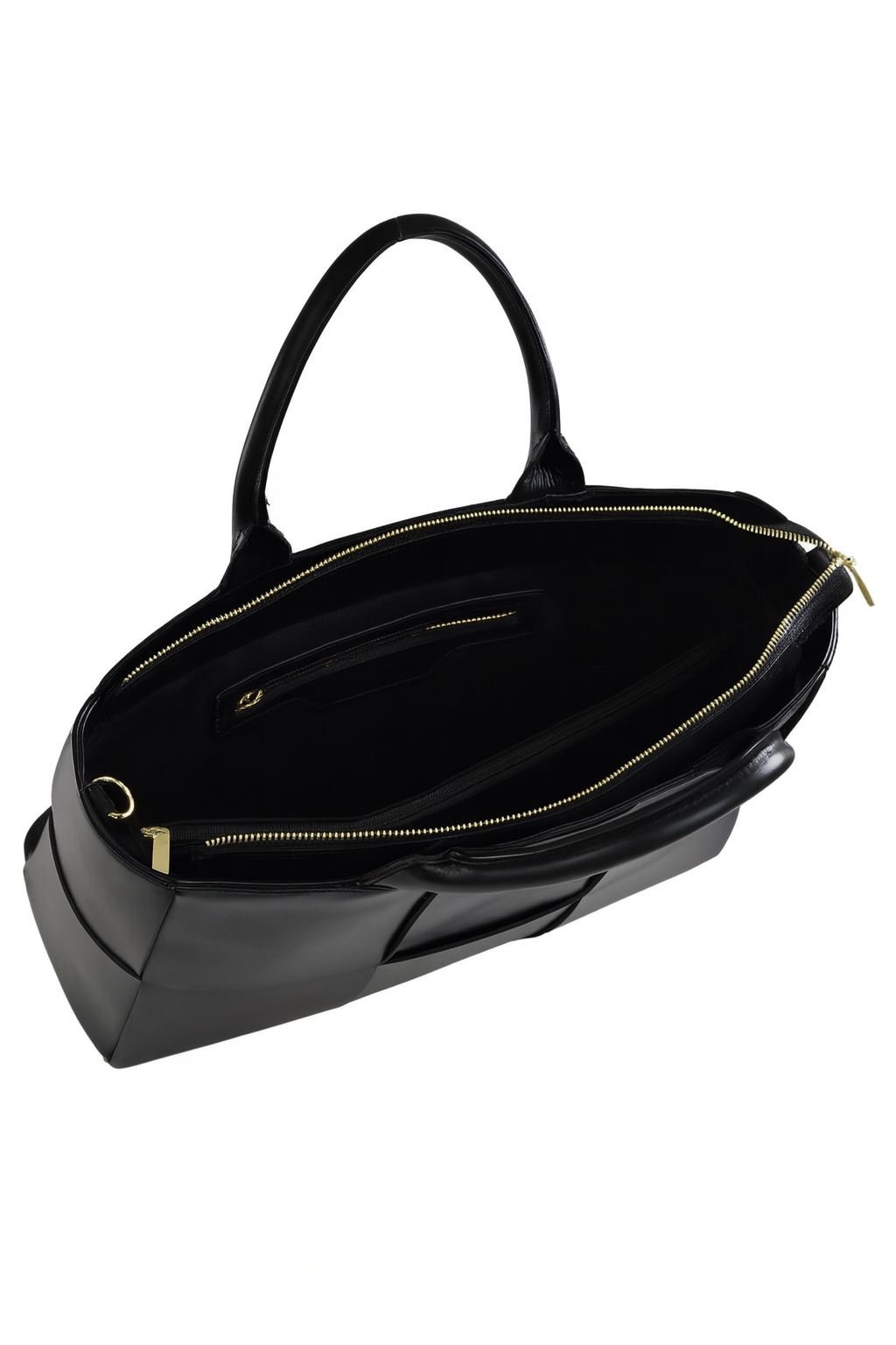 • Mala preta de mão com interior forrado e fecho dourado vista de cima