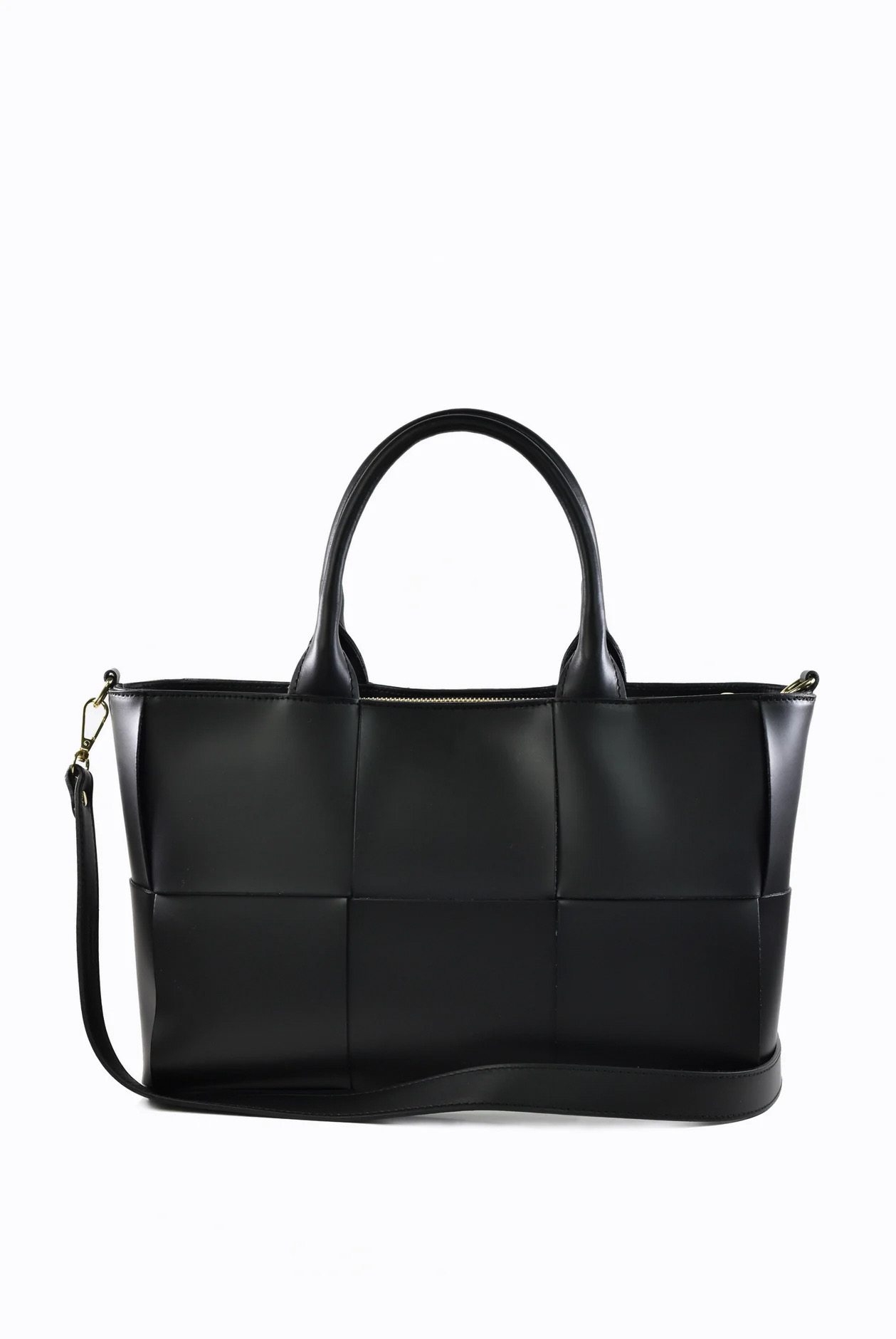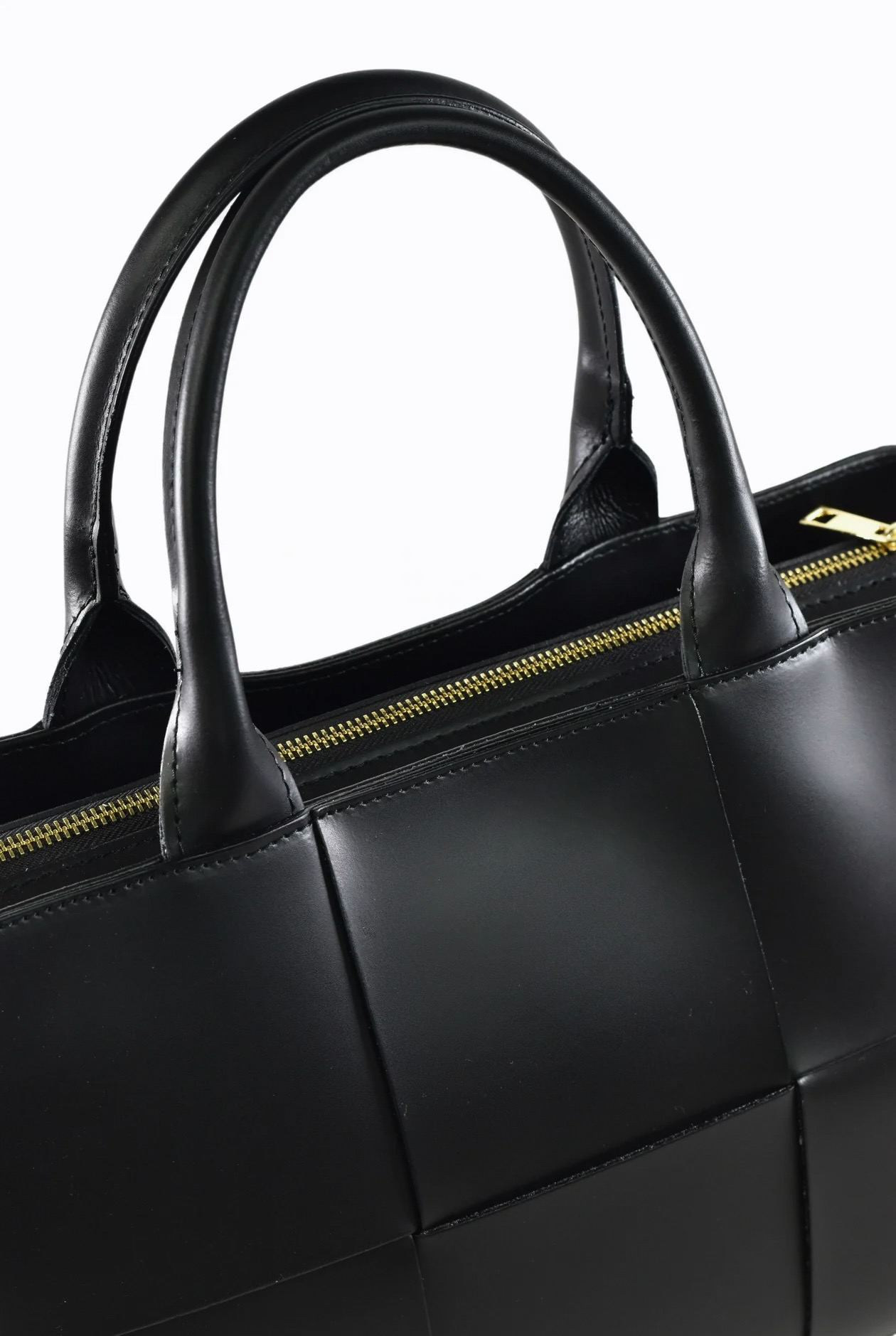 • Mala de mão preta de couro com padrão entrelaçado e fecho dourado