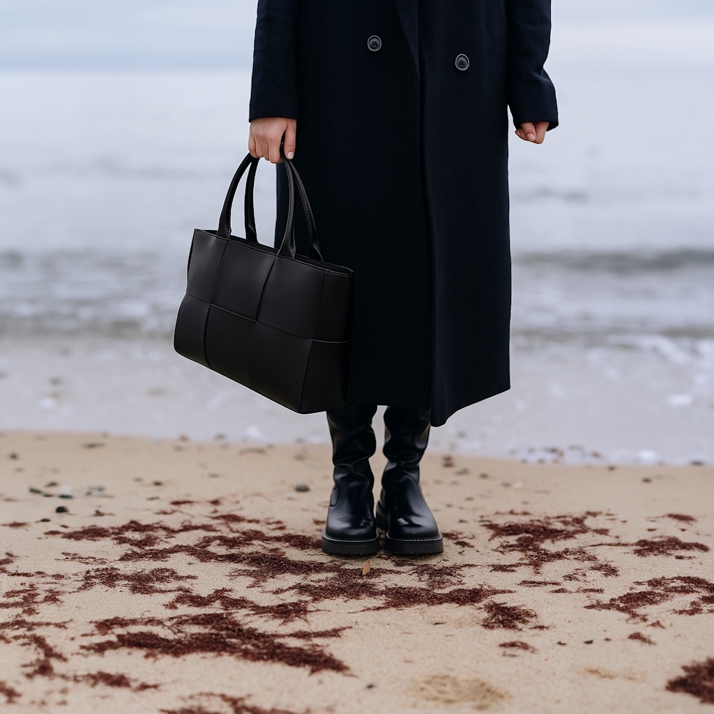 • Bolsa de couro preta entrelaçada na mão de pessoa com casaco e botas pretas na praia